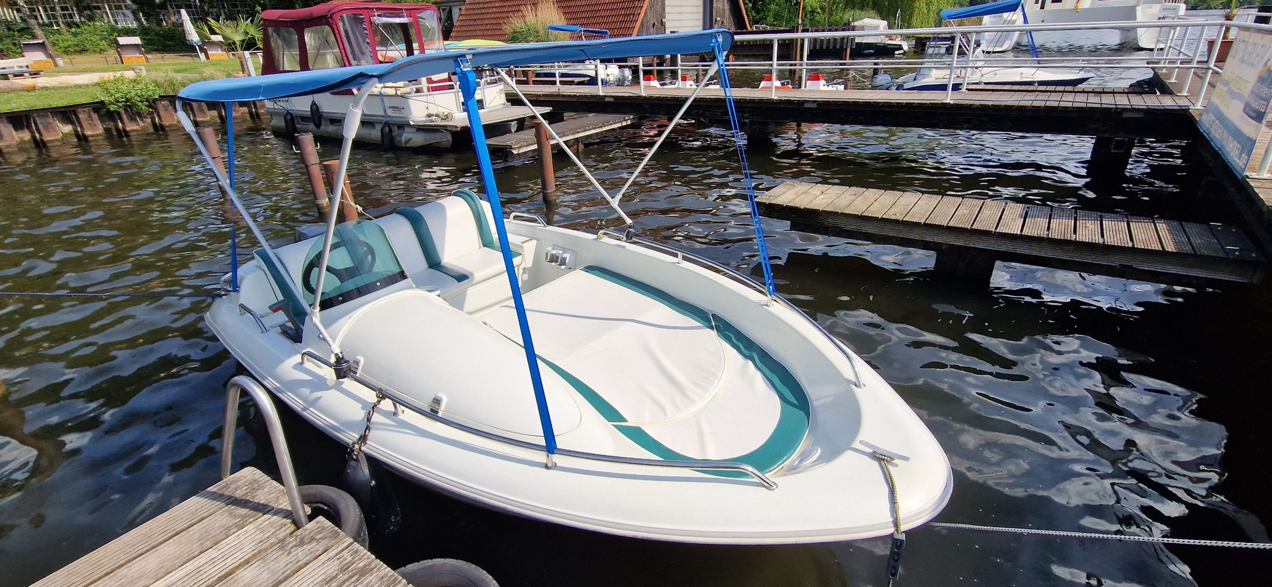 Bequeme Polstersitze, Sonnendach und eine gemütliche Liegefläche sorgen für Komfort auf dem Wasser. Geeignet für Einsteiger ebenso wie für erfahrene Freizeitkapitäne.